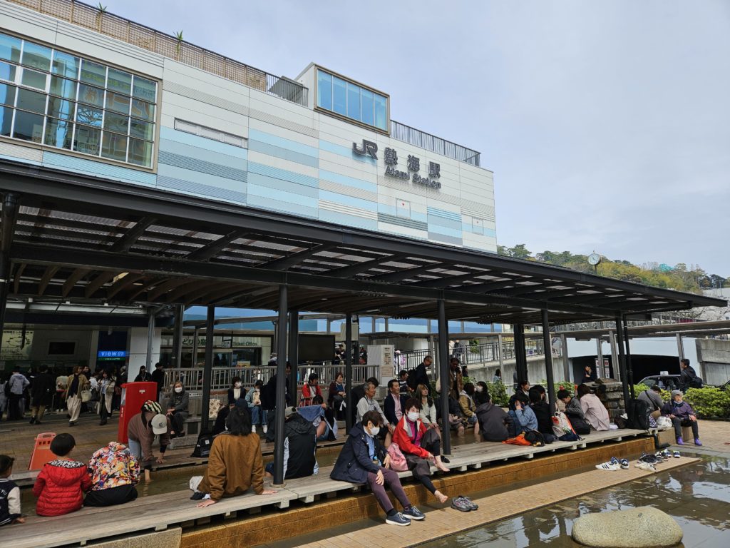 東京駅から東海道新幹線で約40分、熱海駅に到着しました。駅の眼の前には家康の湯という足湯があります。向かって右側に進むと熱海港行きの路線バスの発着場があります。