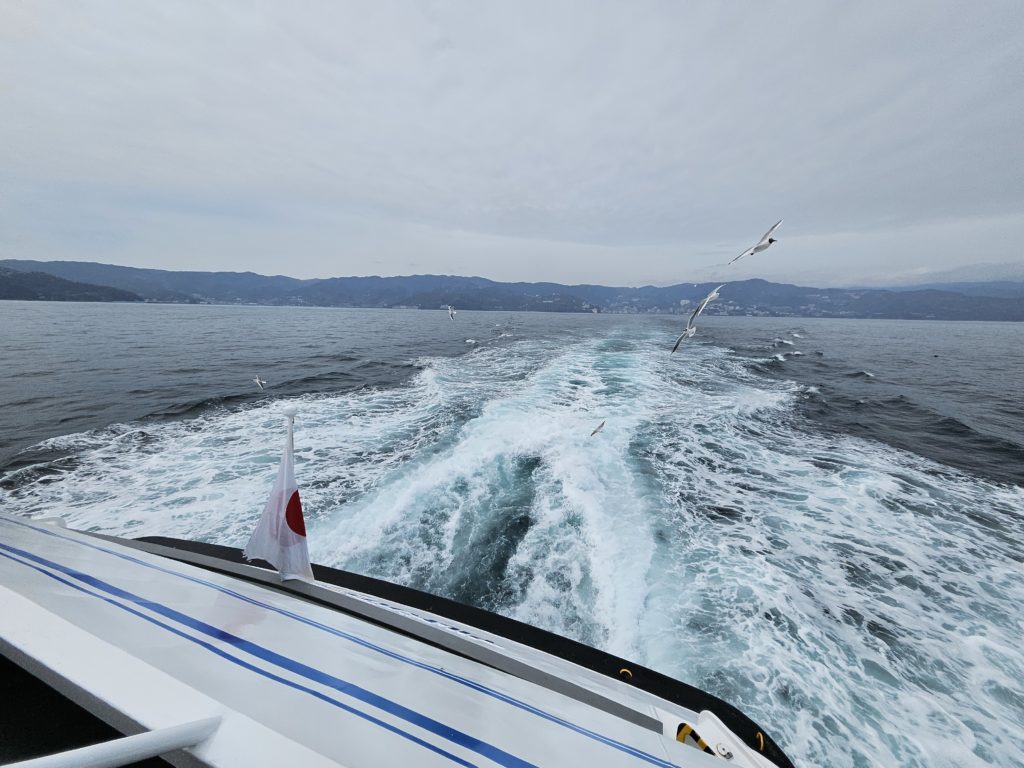 船内は最大で600名が乗船できるそうです。今日は土曜日ということもあり大勢の方が乗船されていましたが、席は満席にはなっていないようでした。高速船のためあっという間に熱海を離れていきます。約30分間の船旅です。