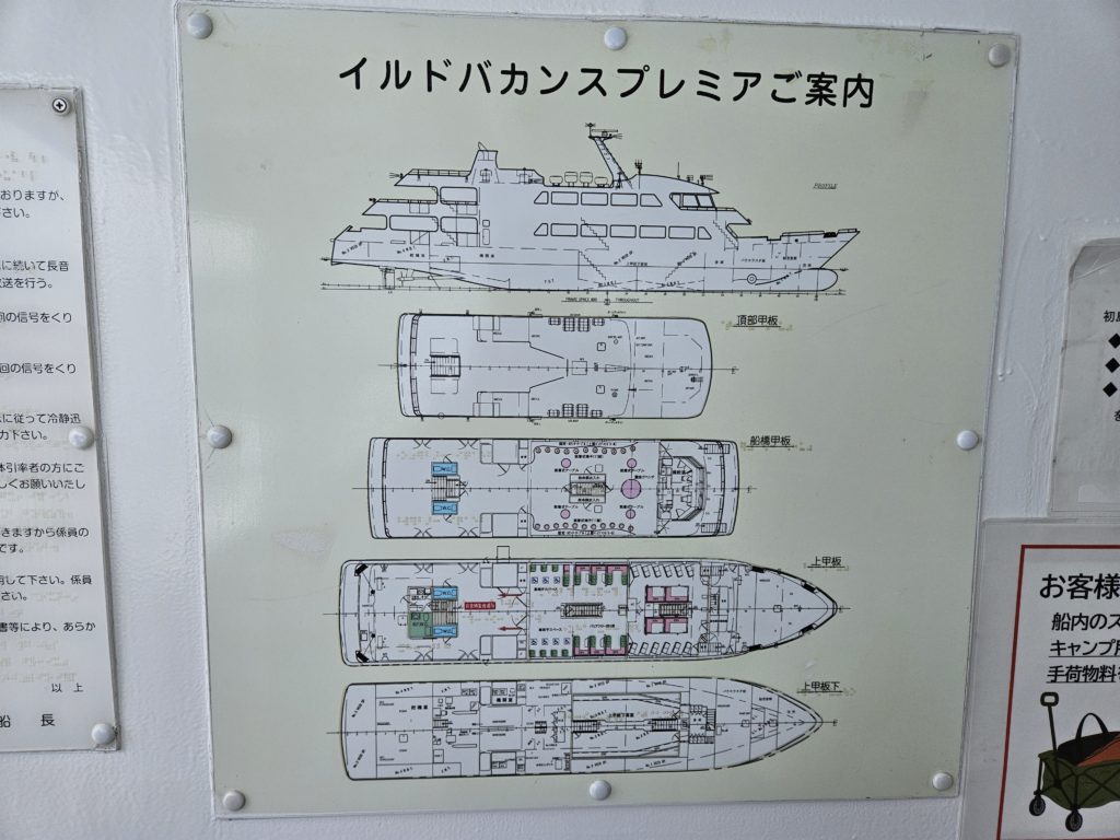 船内はご覧のようになっています。甲板下には雑魚寝スペースも用意されており、船酔いする方には最適かもしれません。この日は曇りでしたが、そこそこ揺れており、人によっては酔う方もいたようです。
