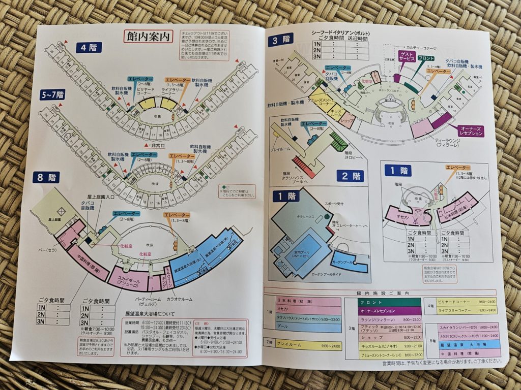 館内の案内です。8階には展望温泉大浴場があり、海を眺めながら天然温泉・サウナを楽しむことができます。
