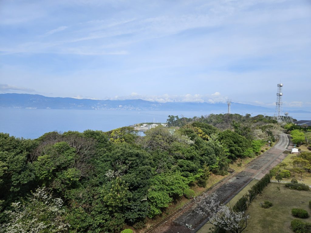 初島灯台にやってきました。珍しい”登ることができる”灯台で、1人300円支払うと簡単なミュージアムと灯台見学ができます。高さはそこまでではありませんが、360度のパノラマビューが楽しめます。眼の前に見えるのはNHK・SBS(静岡放送)の放送塔です。