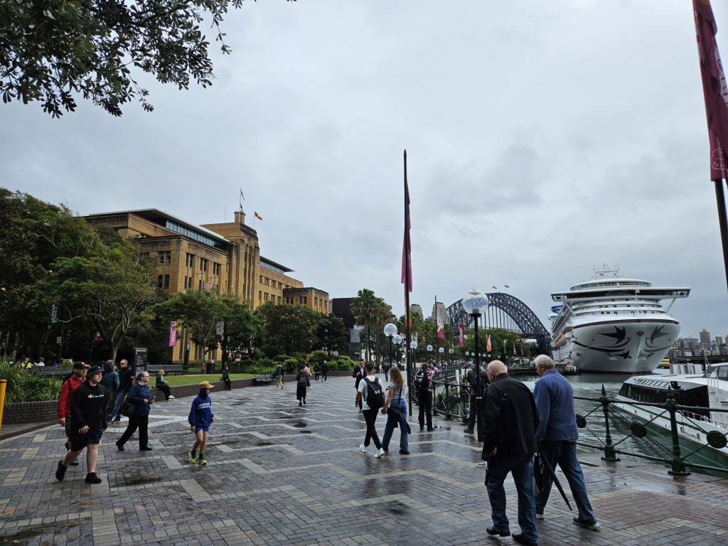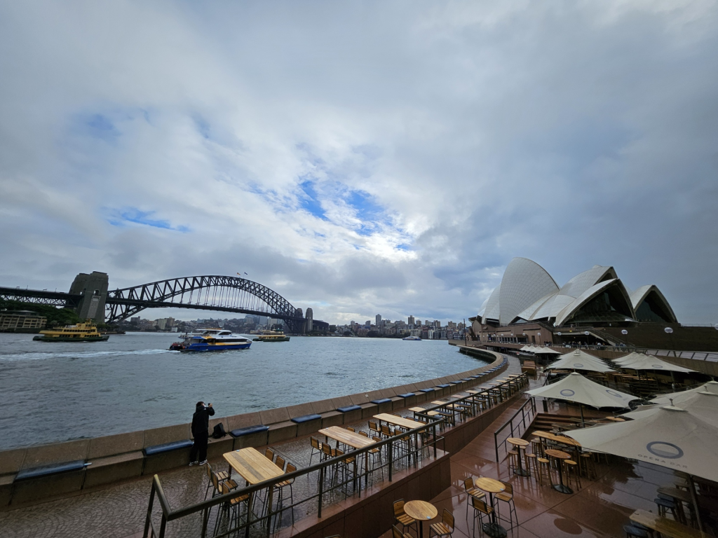 あいにくの天気ですが、シドニーオペラハウスとハーバーブリッジを望みます。朝8時ごろのため人影もまばらです。