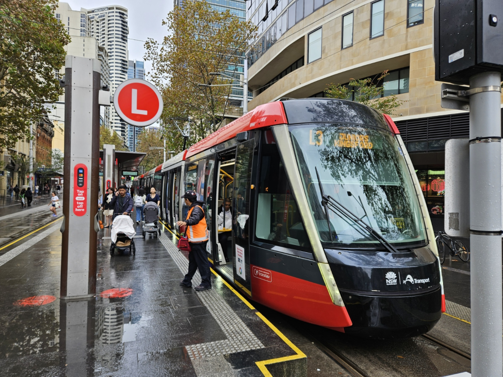 シドニーのライトレールを使って中心部を南下していきます。ここでもクレジットのタッチ決済が利用できます。乗るとき、降りるときに駅の柱にある端末にタップします。(忘れると罰金を支払わないといけないようなので注意してください。車内検札が何度かありました。)