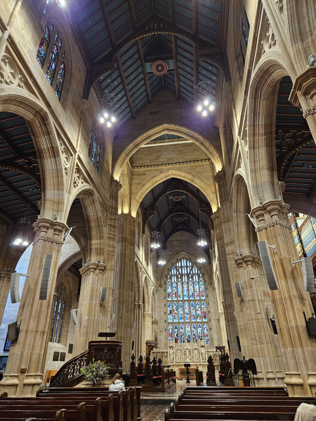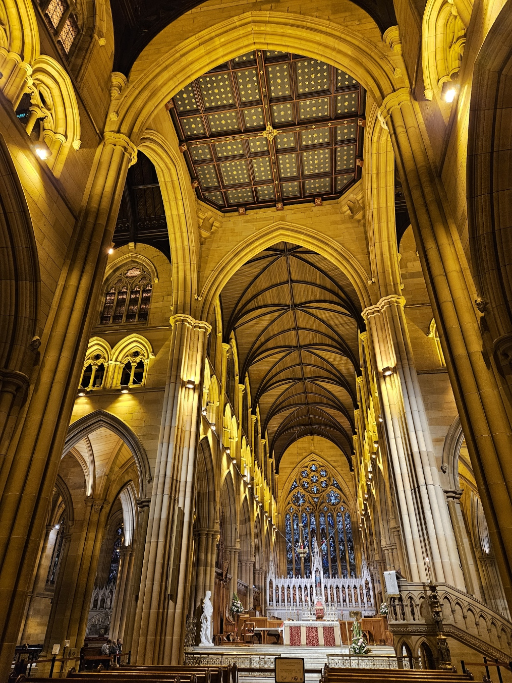 セント・メアリー大聖堂の内部は、壮大なゴシックアーチと華麗なステンドグラスが特徴です。天井の装飾や光が織りなす空間は、神聖で荘厳な雰囲気を醸し出しています