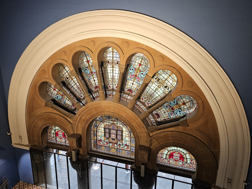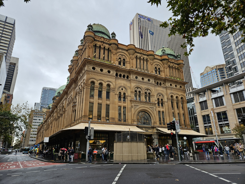 こちらは「クイーン・ヴィクトリア・ビルディング」(Queen Victoria Building、QVB)です。QVBは、シドニーの歴史と優雅さを象徴するランドマークであり、1898年に完成しました。この建物は、ロマネスク・リバイバル様式の建築として有名で、その壮大な外観は細部に至るまで美しく装飾されています。もともとは市場として建設されたこの建物は、現在では高級ブティックやレストラン、カフェが集まるショッピングセンターとして利用され、地元の人々や観光客に愛されています。