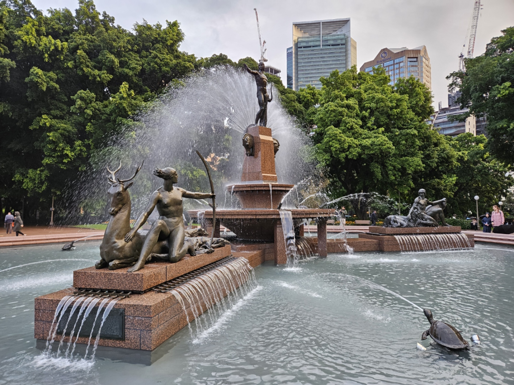 ハイド・パーク・バラックス見学後は、ハイドパークを散策しました。こちらは、公園内にある有名な「アーチボルド噴水」(Archibald Fountain)です。フランスの彫刻家フランソワ=レオン・シシリアンによって1932年に設計されました。ギリシャ神話に基づく彫像が特徴で、中央にはアポロンが立ち、その周囲にアルテミスやテセウスなどの神話の人物が配置されています。