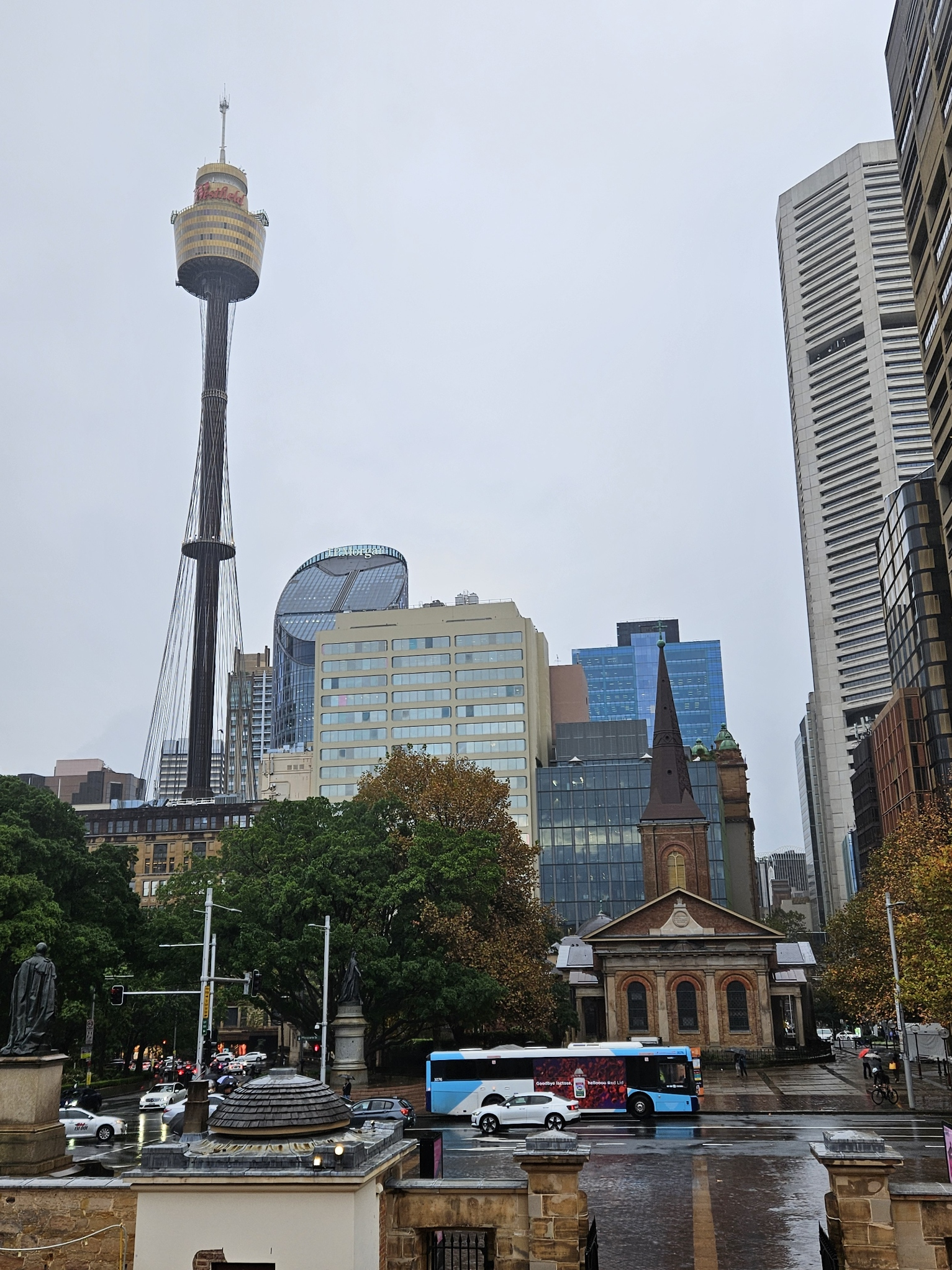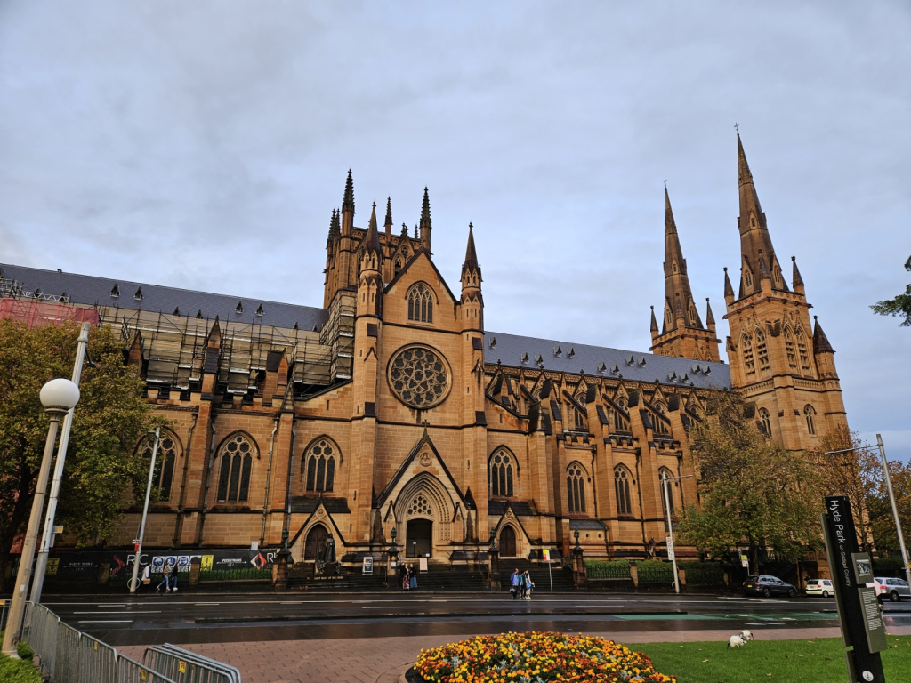 続いては、ハイドパーク至近の「セント・メアリー大聖堂」(St Mary’s Cathedral)に来ました。ゴシックリバイバル様式が特徴の壮麗な大聖堂で、オーストラリアで最も重要なカトリック教会です。1874年に着工し、完成までに数十年を要しました。その美しい双塔とステンドグラスが見事で、内部には歴史的な彫刻やアートが多数あります。